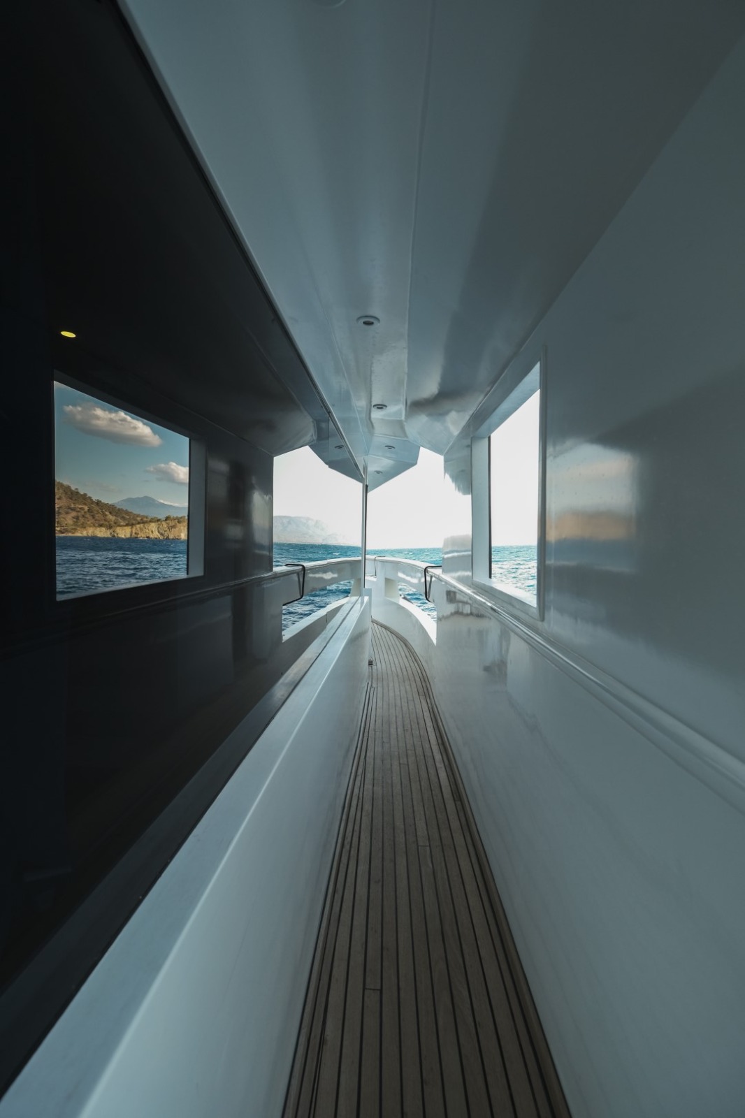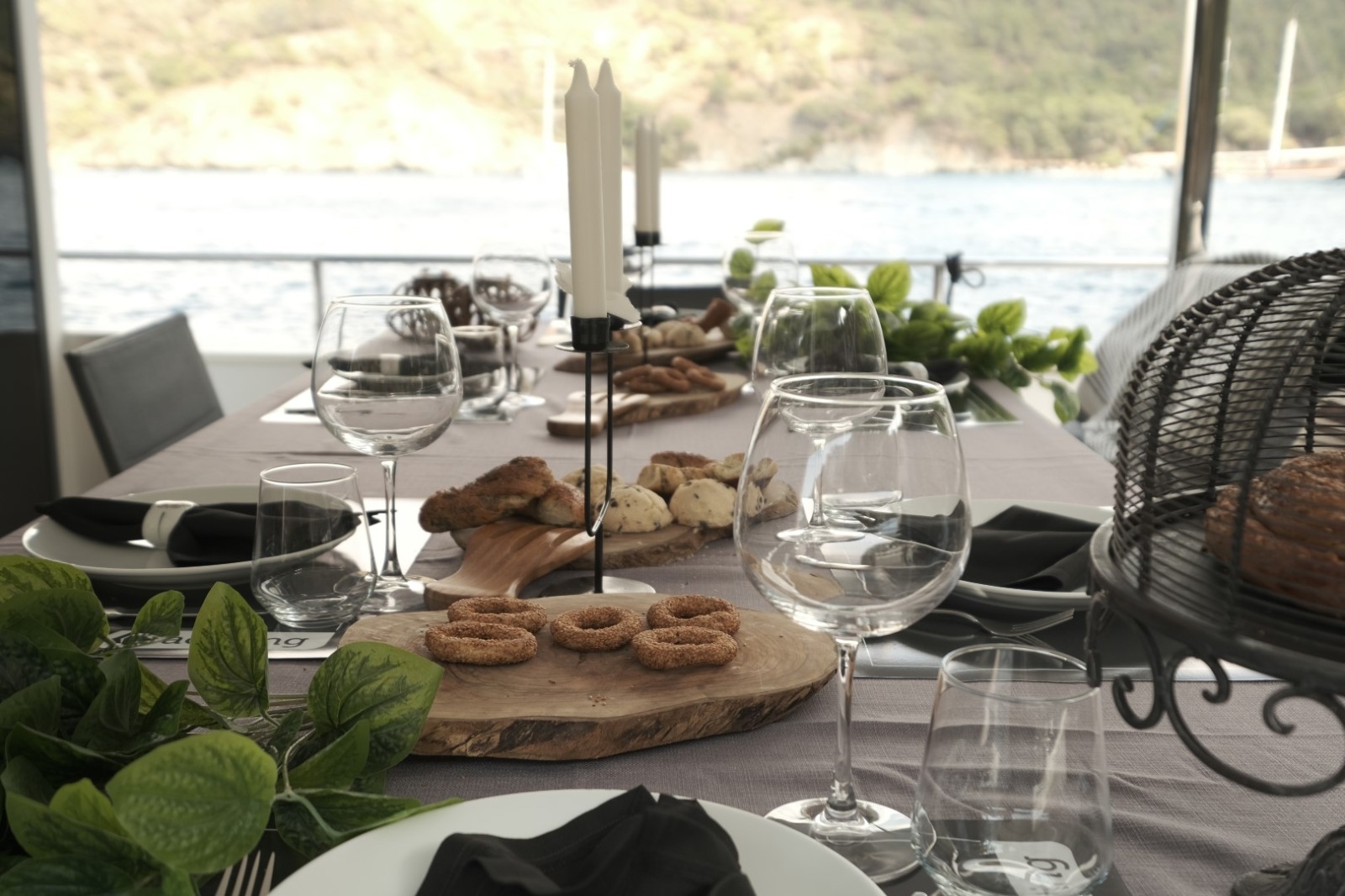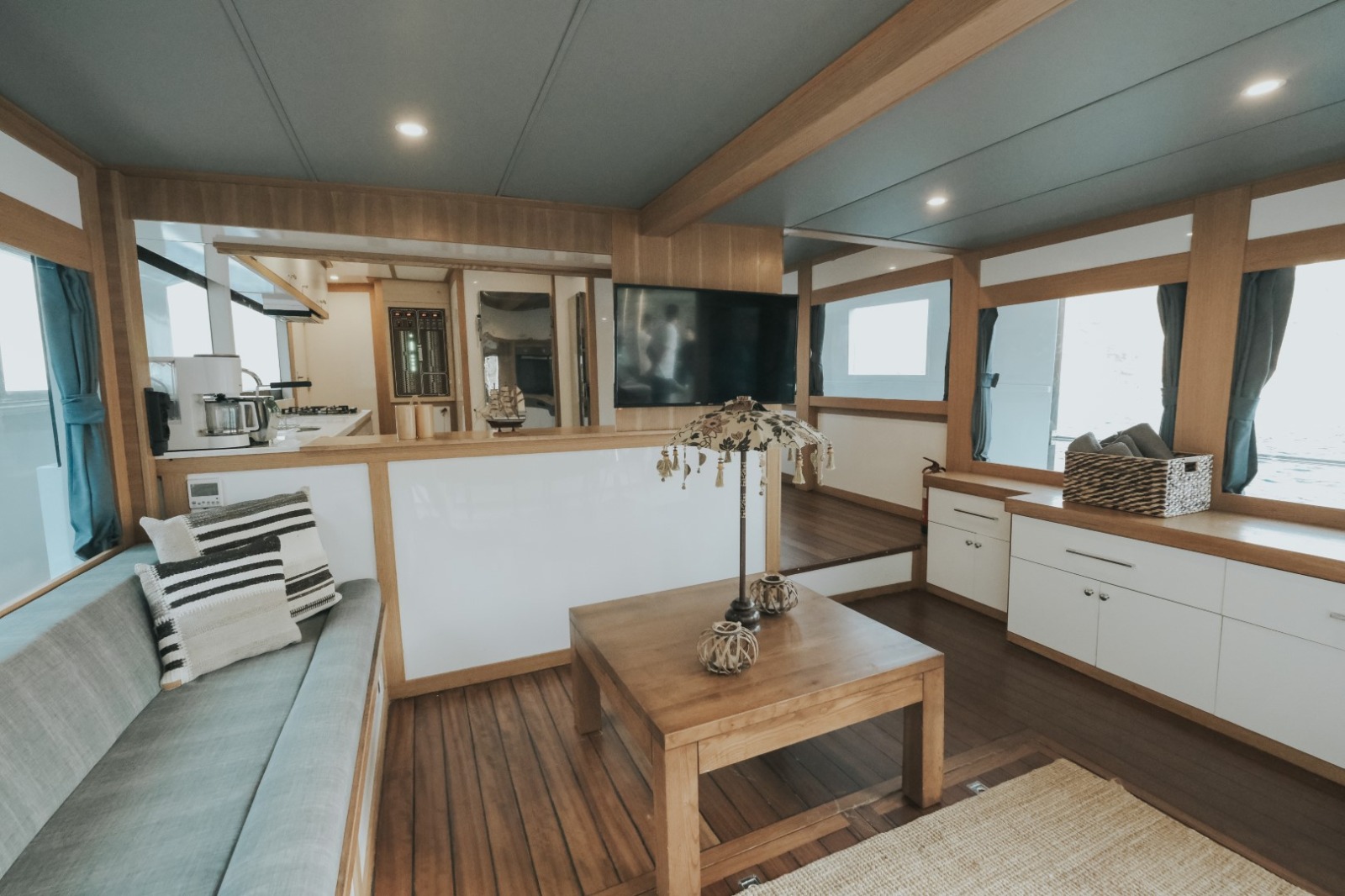 Salon bölümü, son derece ferah ve konforlu bir tur deneyimi sunan ekipmanlardan oluşmaktadır. Kapalı ve sessiz bir ortamda vakit geçirmek ve içeceklerini yudumlamak isteyen misafirlerimiz için ideal bir yaşam alanıdır. Ayrıca oturma odasında klimanın serinliğinde televizyon izlemenin keyfini çıkarabilirsiniz. Salonun hemen yanında Amerikan mutfak, bar ve servis tezgahı bulunmaktadır. Üst kokpitte ise muhafazakar misafirlerin de tercih ettiği korunaklı bir güneşlenme alanı bulunmaktadır.