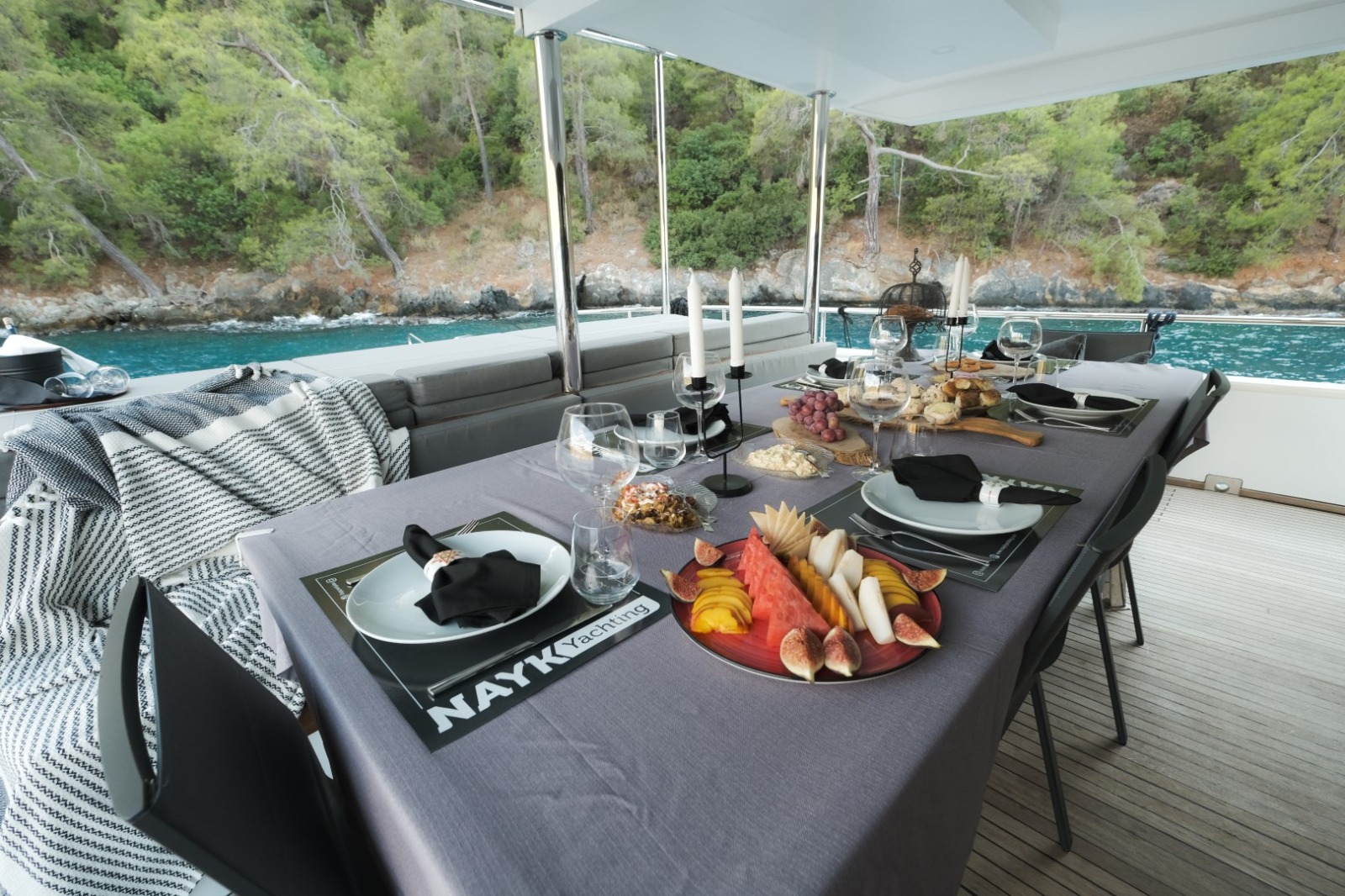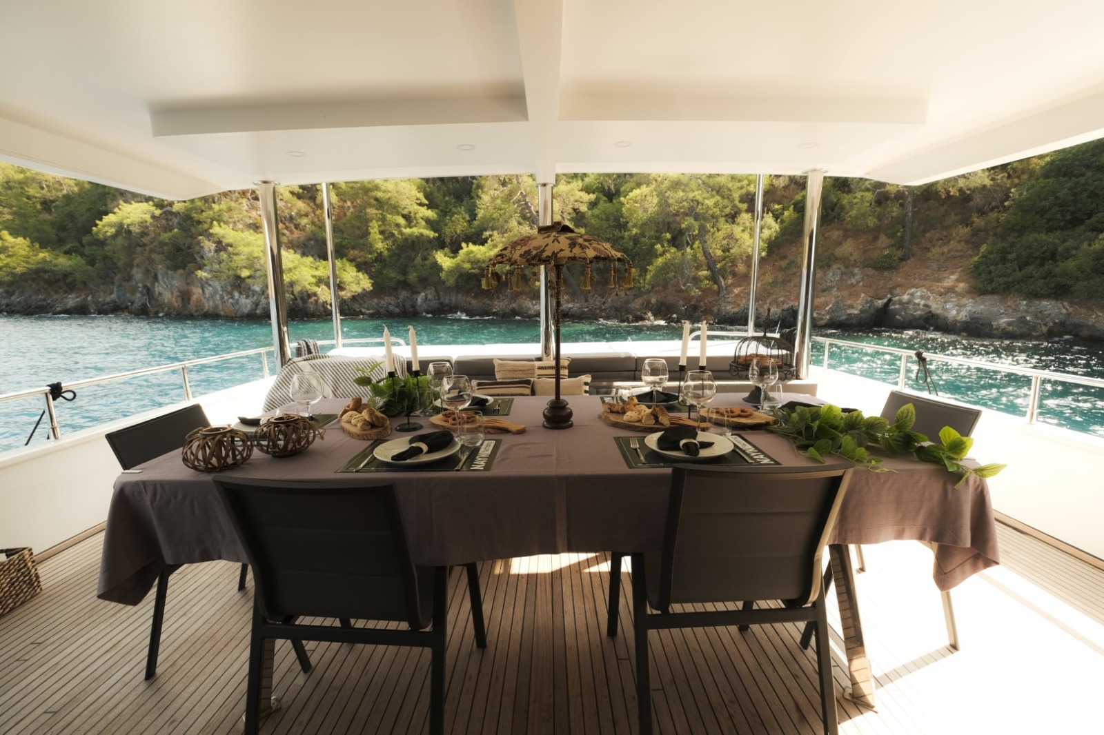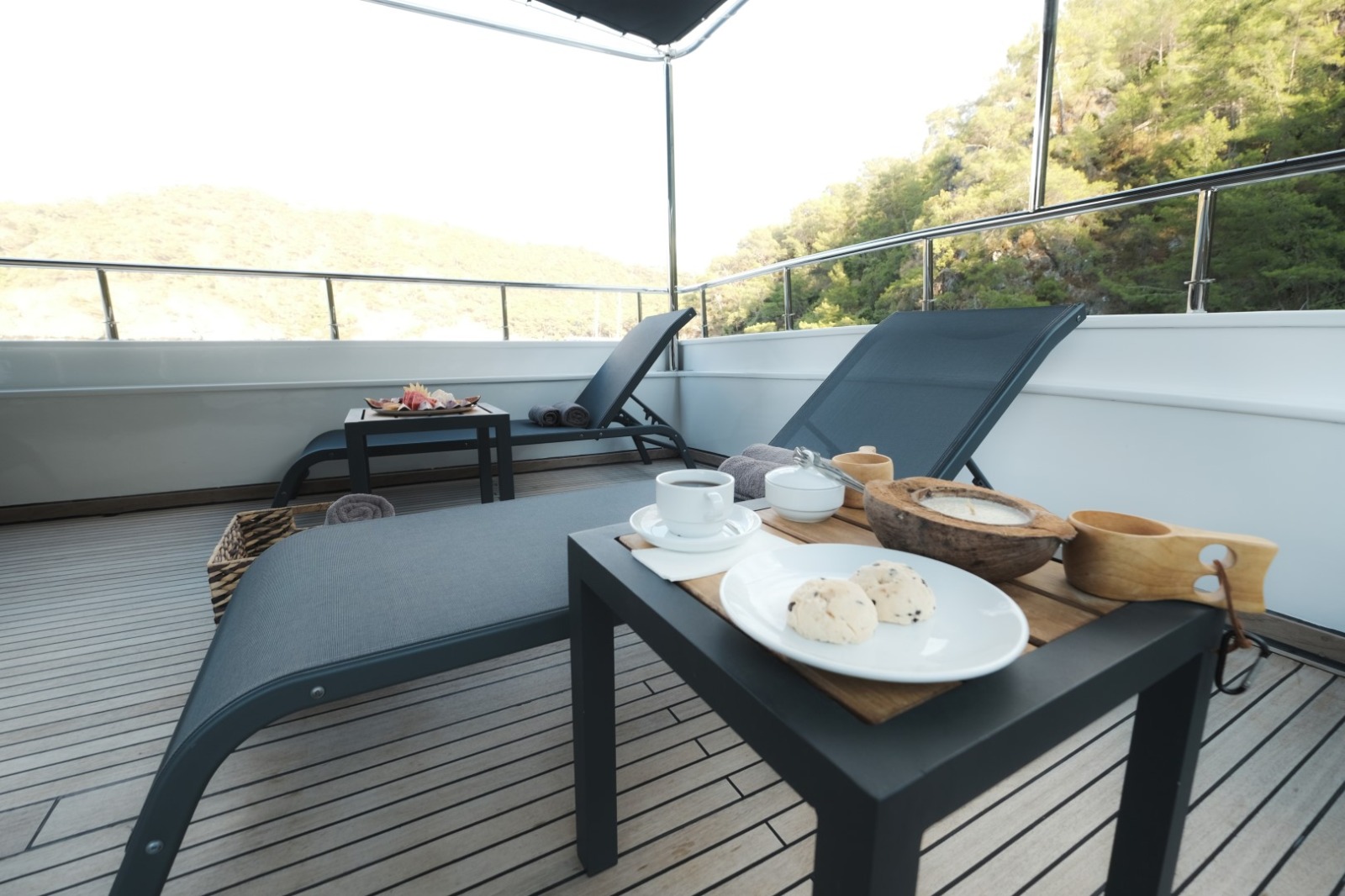Nayk 1 Trawler yatımızın kıç tarafında, denize yakın bir yüzme platformu bulunmaktadır. Misafirlerimizi girişte karşılayan bu geniş platform, tur boyunca harika bir güneşlenme ve yüzme alanı sunmaktadır. Kıç güvertede güneşlenme minderleri, şık bir oturma grubu ve yemek masası bulunmaktadır. Arka güneşlenme minderlerine ek olarak, üst ön bölümde geniş bir güneşlenme minderi ve üst arka kokpit güneşlenme alanında hareketli şezlonglar ve oturma grubu bulunmaktadır.