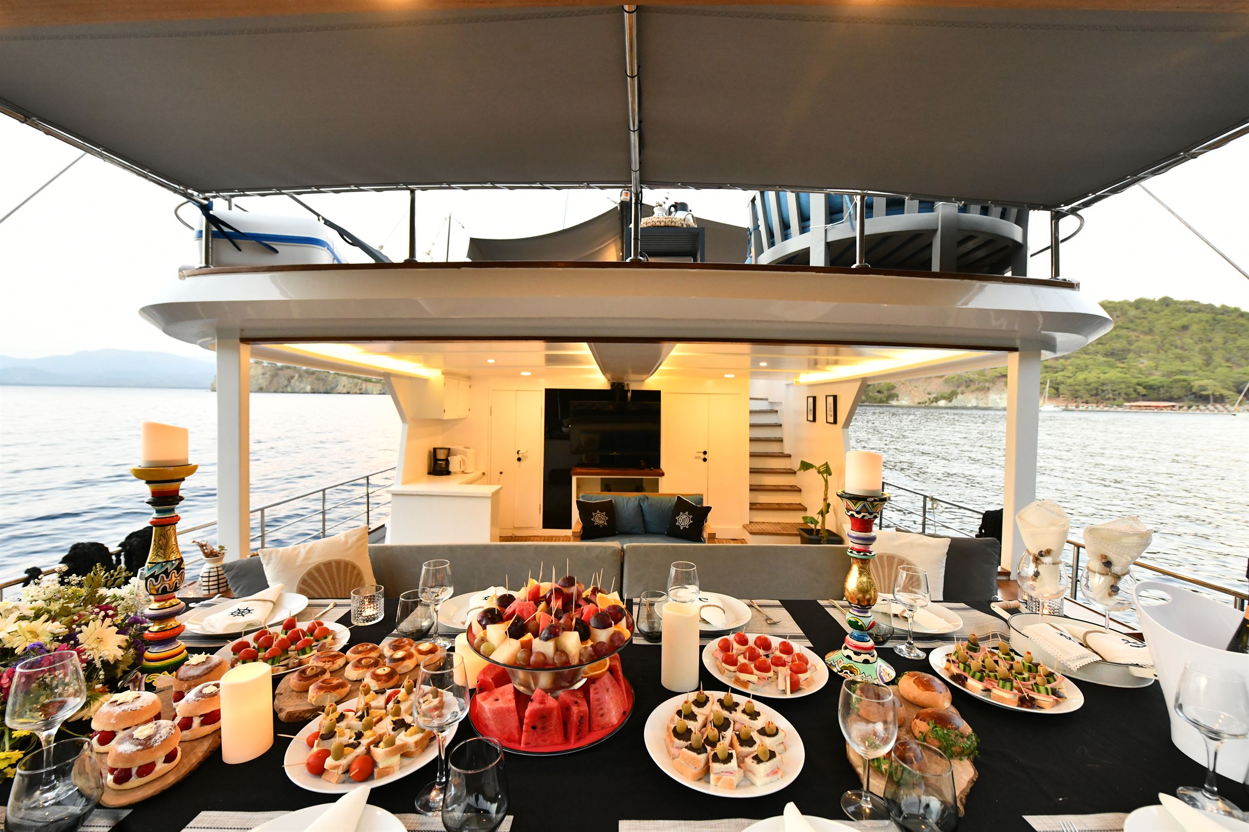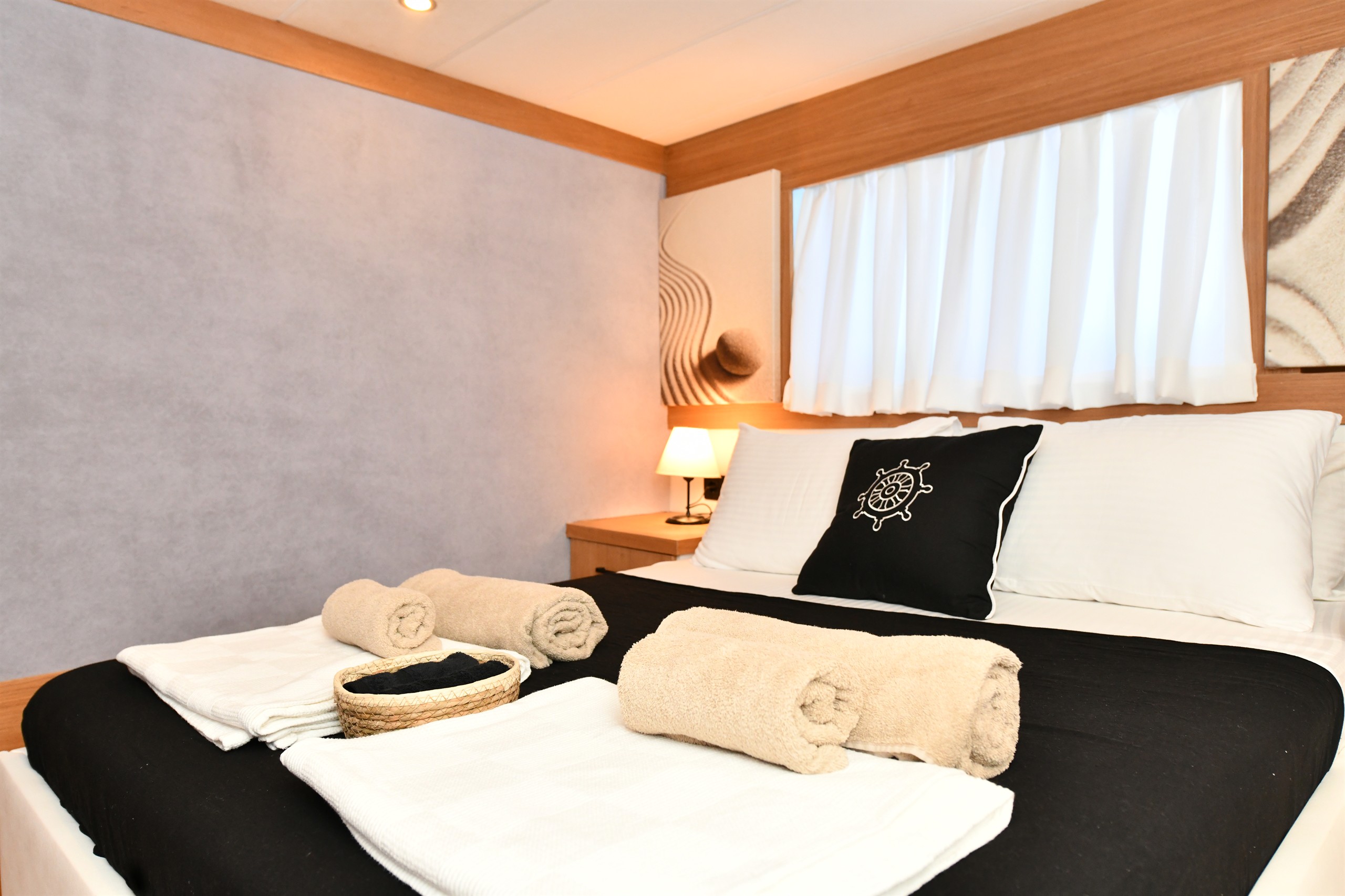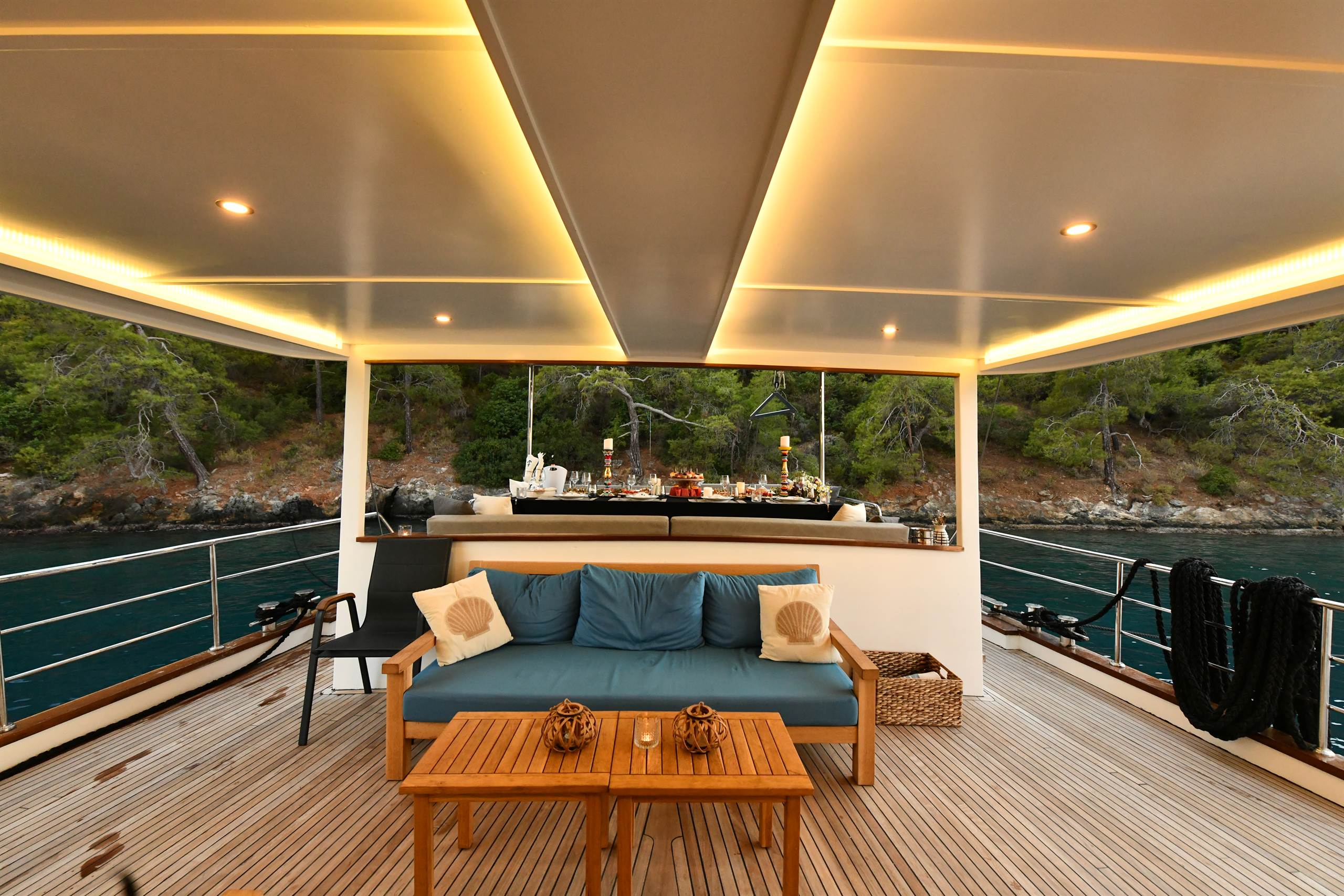Tüm kabinlerinde ev tipi wc , duş kabinli banyo , klima ve Tv mevcuttur. Ayrıca misafirlerini ağırladığı modern ve konforlu salonunda klima ve eğlence sistemi adına Tv, cd/dvd , mp3 playera sahiptir. Flybridge , ön ve arka güvertelerinde yeterli miktarda güneşlenecek ve dinlenecek şezlongları vardır. Su sporları da isteyen misafirler için su kayağı , kano , ringo , paddle board ve dalış ekipmanları mevcuttur.