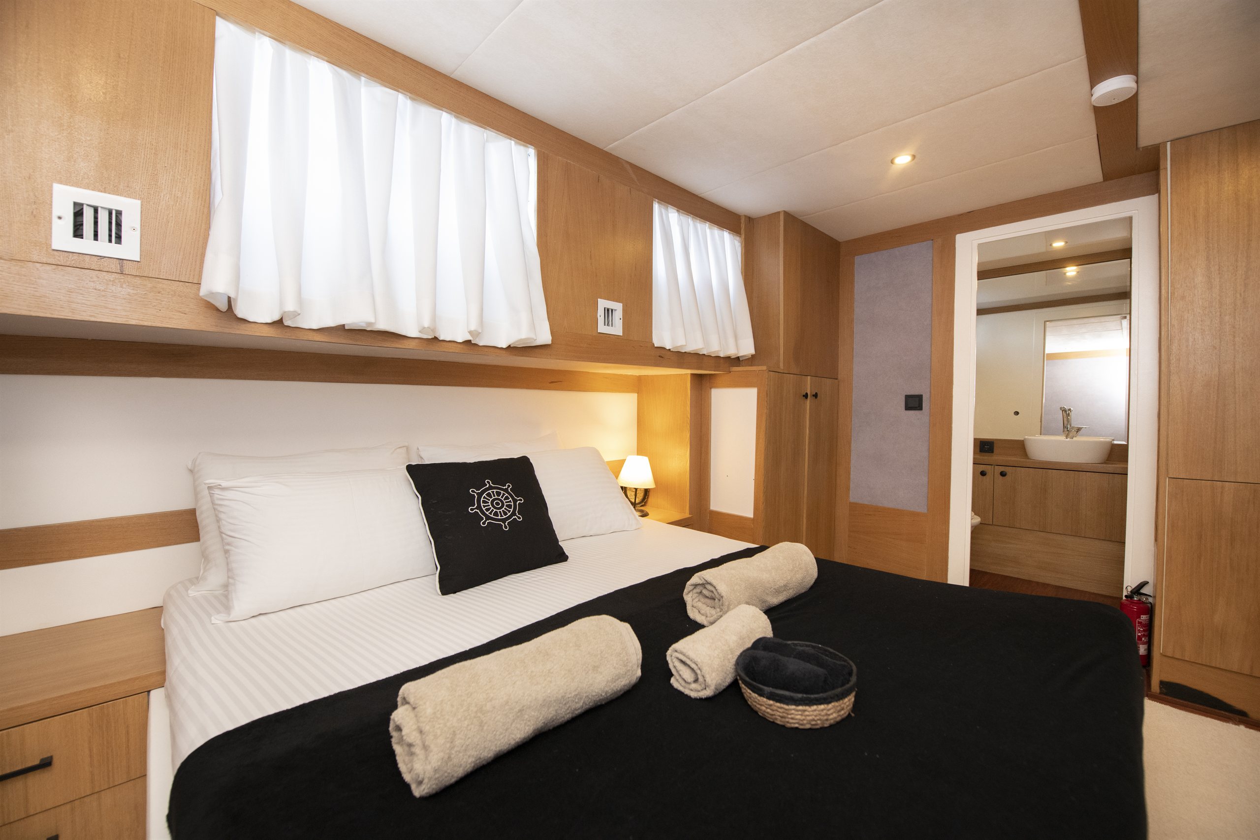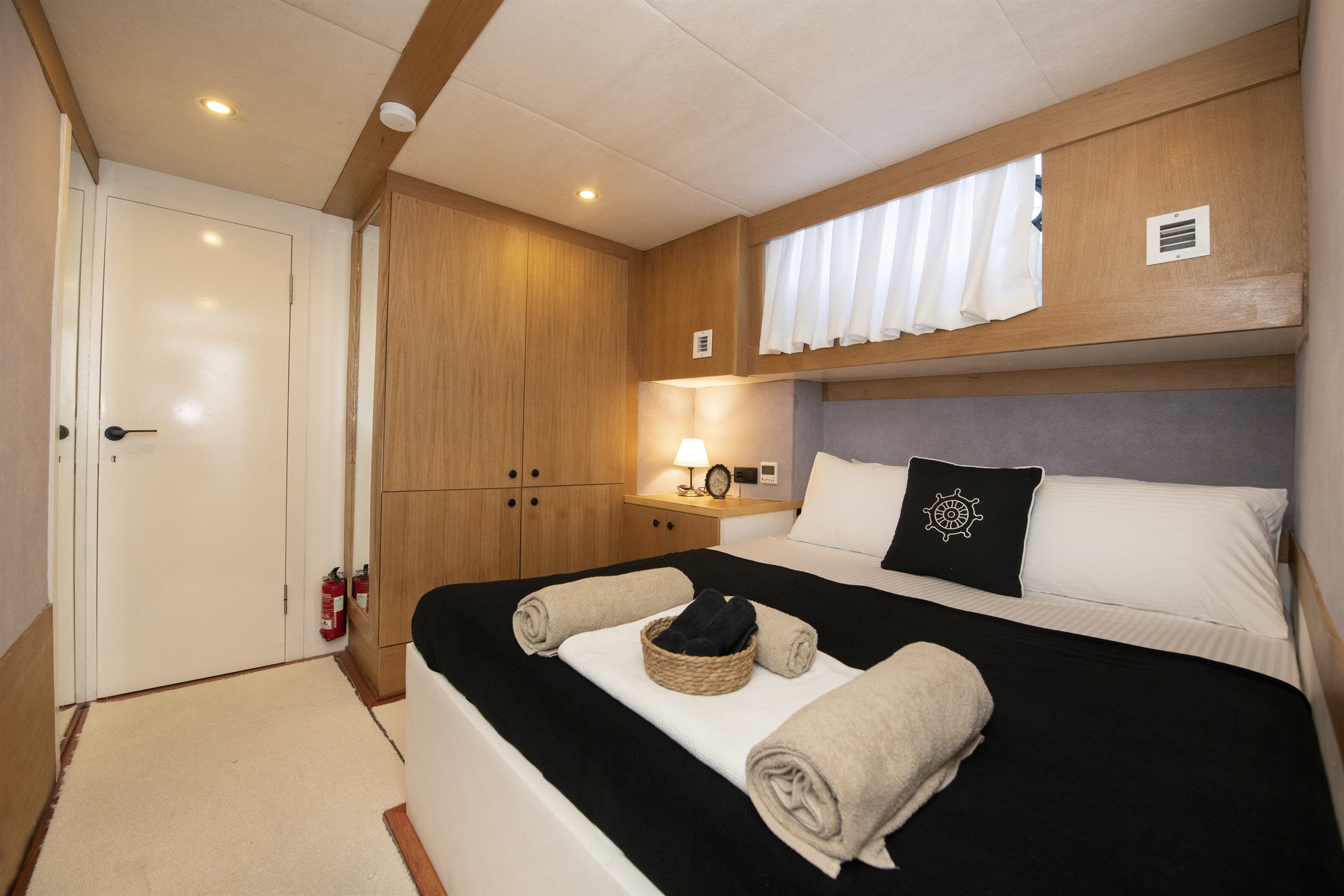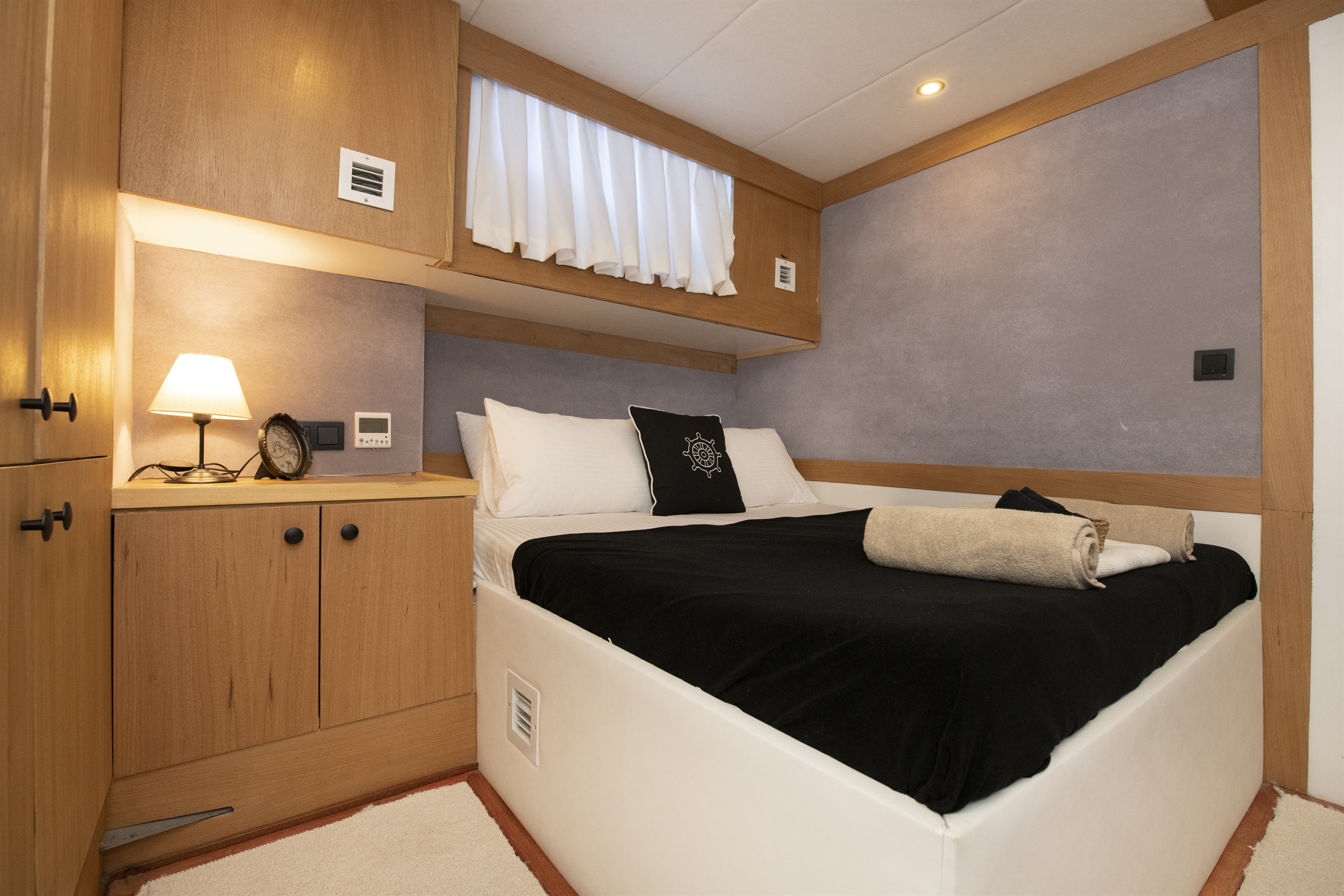 Tüm kabinlerinde ev tipi wc , duş kabinli banyo , klima ve Tv mevcuttur. Ayrıca misafirlerini ağırladığı modern ve konforlu salonunda klima ve eğlence sistemi adına Tv, cd/dvd , mp3 playera sahiptir. Flybridge , ön ve arka güvertelerinde yeterli miktarda güneşlenecek ve dinlenecek şezlongları vardır. Su sporları da isteyen misafirler için su kayağı , kano , ringo , paddle board ve dalış ekipmanları mevcuttur.