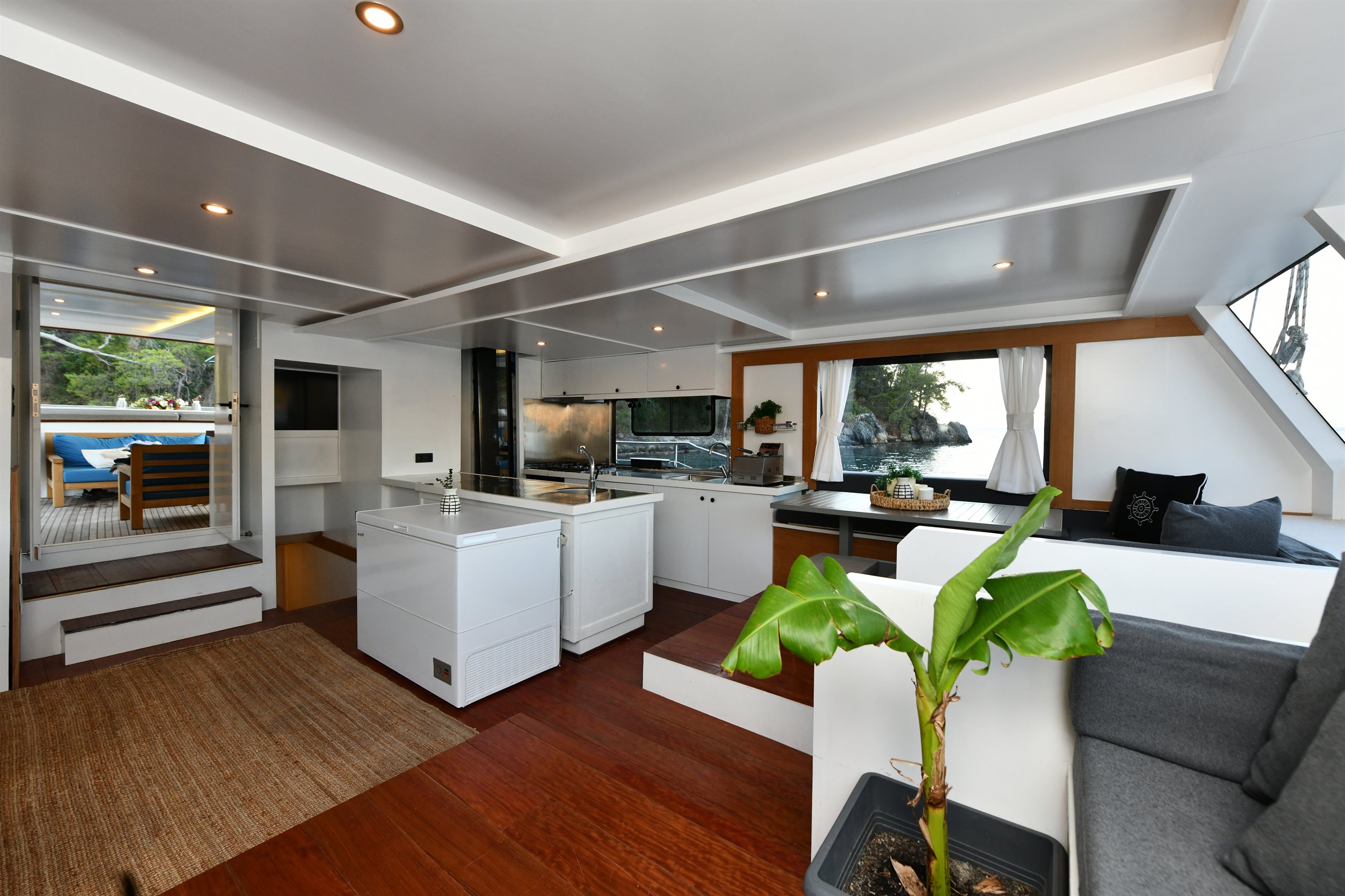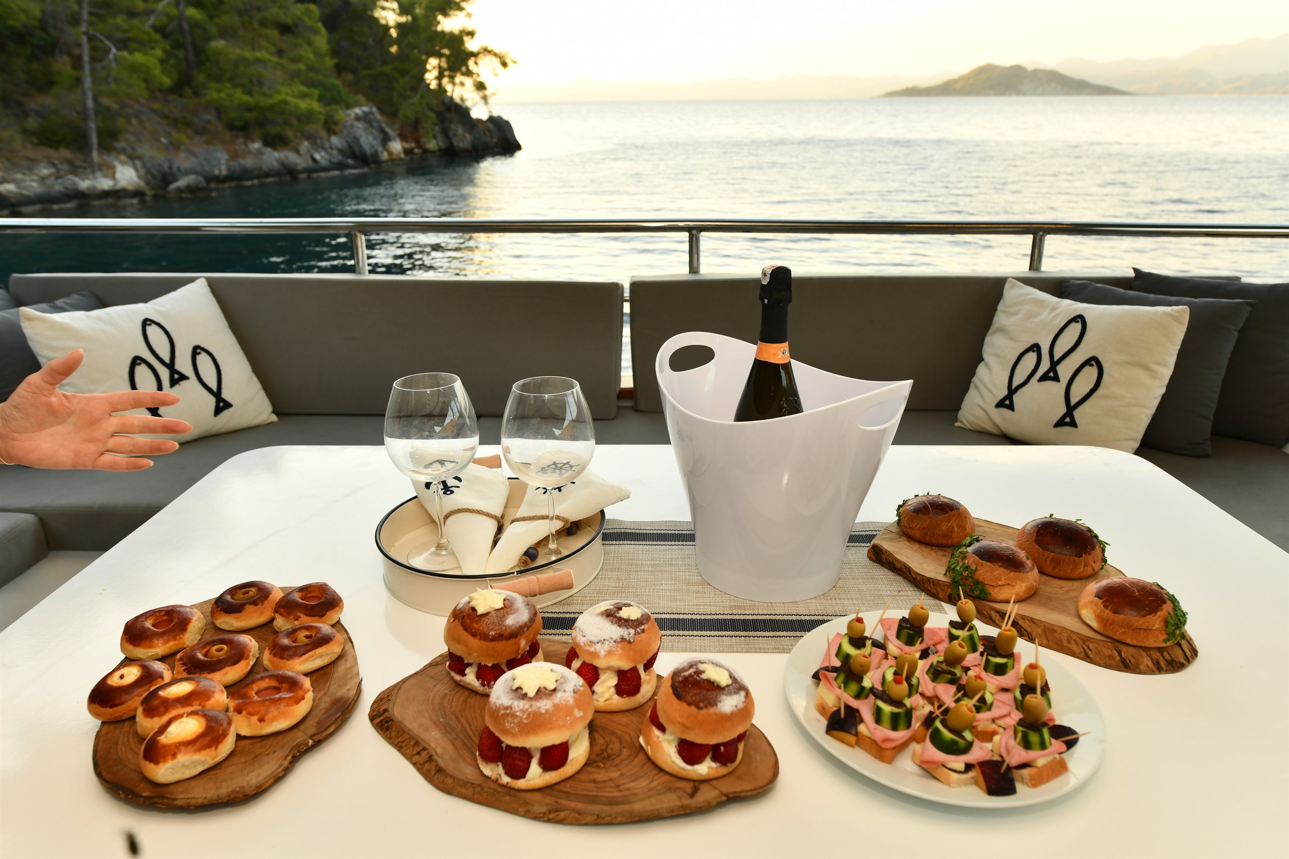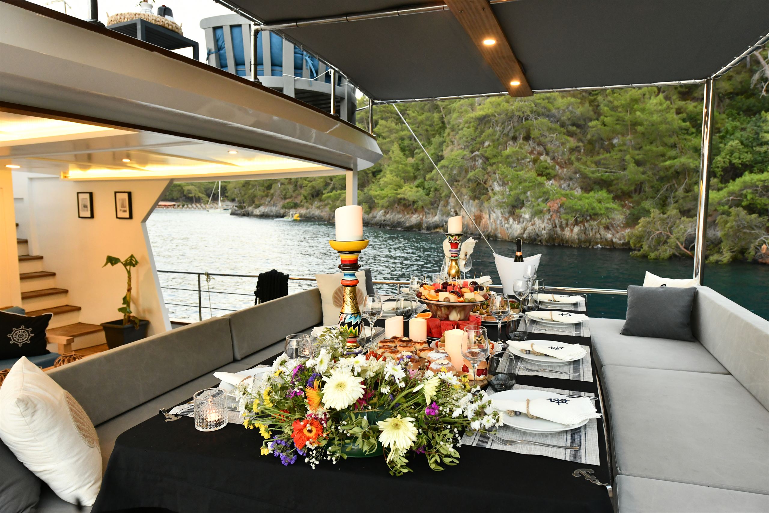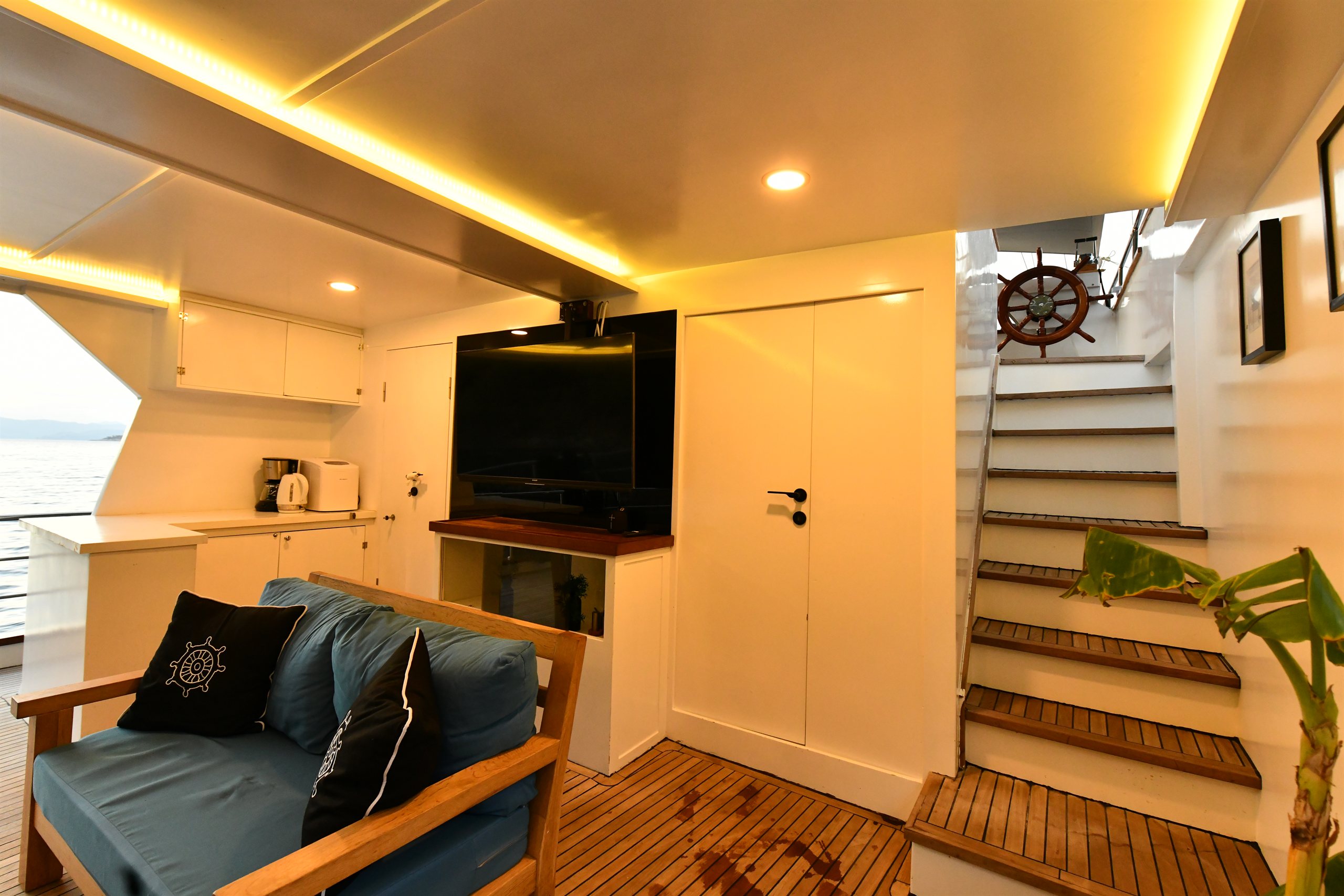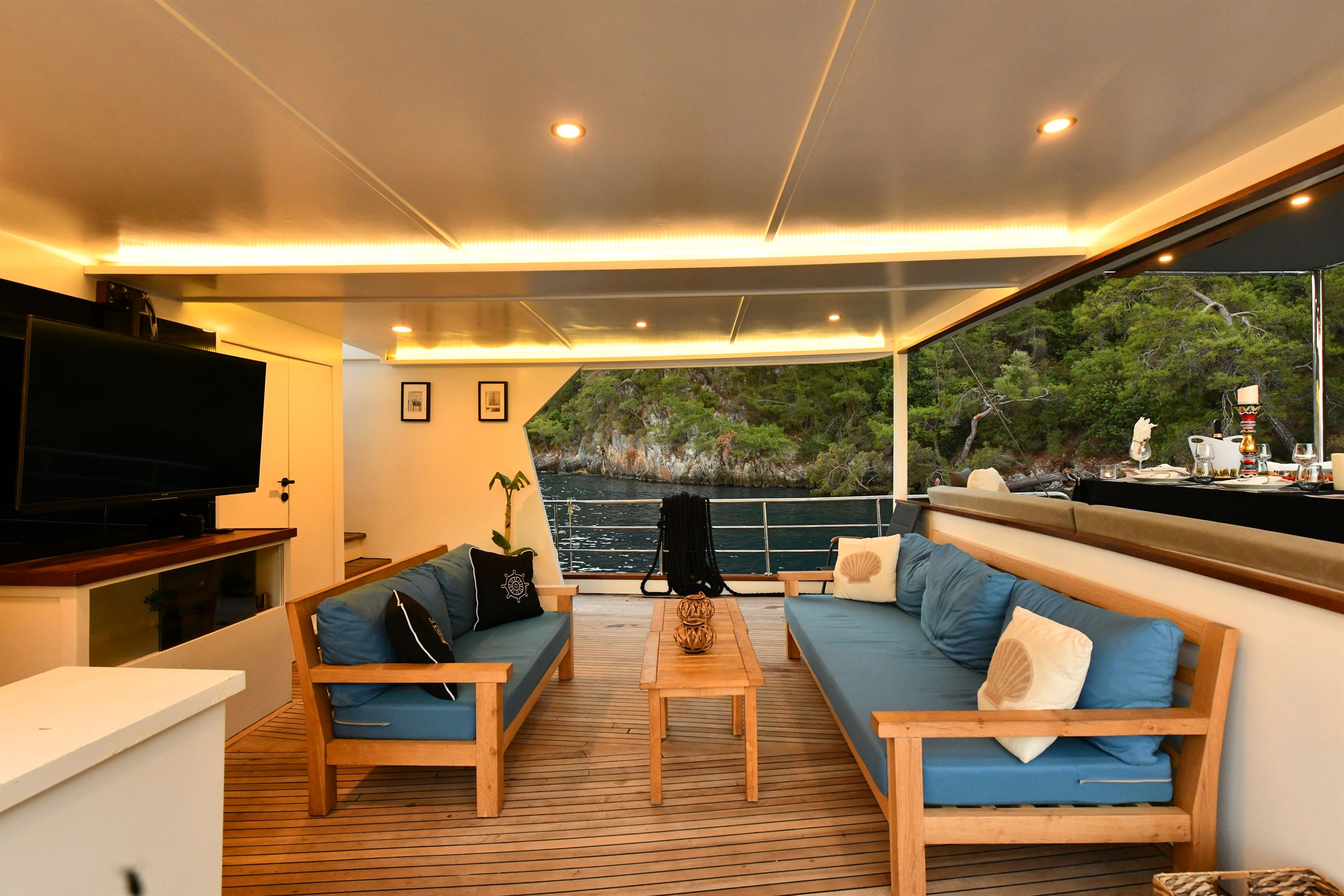 Tüm kabinlerinde ev tipi wc , duş kabinli banyo , klima ve Tv mevcuttur. Ayrıca misafirlerini ağırladığı modern ve konforlu salonunda klima ve eğlence sistemi adına Tv, cd/dvd , mp3 playera sahiptir. Flybridge , ön ve arka güvertelerinde yeterli miktarda güneşlenecek ve dinlenecek şezlongları vardır. Su sporları da isteyen misafirler için su kayağı , kano , ringo , paddle board ve dalış ekipmanları mevcuttur.